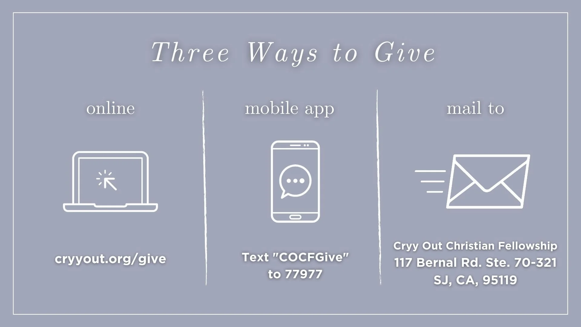 Your continued giving is extremely appreciated and important to the long-term health of Cryy Out Christian Fellowship.